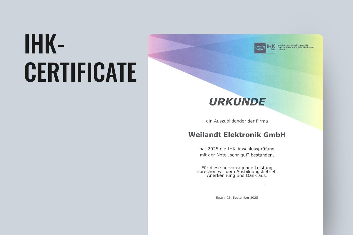 As part of the final examinations of the 2025 training year, an apprentice from Weilandt Elektronik was honored by the Essen Chamber of Industry and Commerce (IHK) for outstanding performance in initial vocational training.